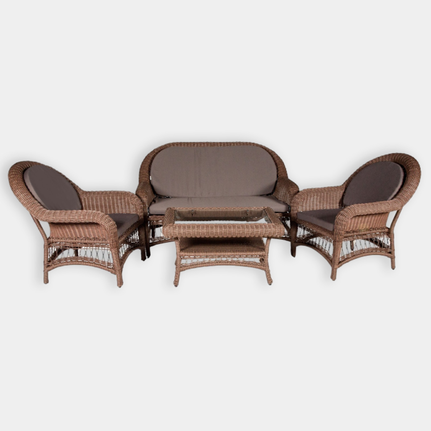 Комплектуется 3-местной софой, 2-мя креслами и кофейным столиком. Ортопедическая форма каркаса - залог удобства и комфорта. Экоротанг неприхотлив в использовании: легко моется, устойчив к перепадам температур, не боится влаги.