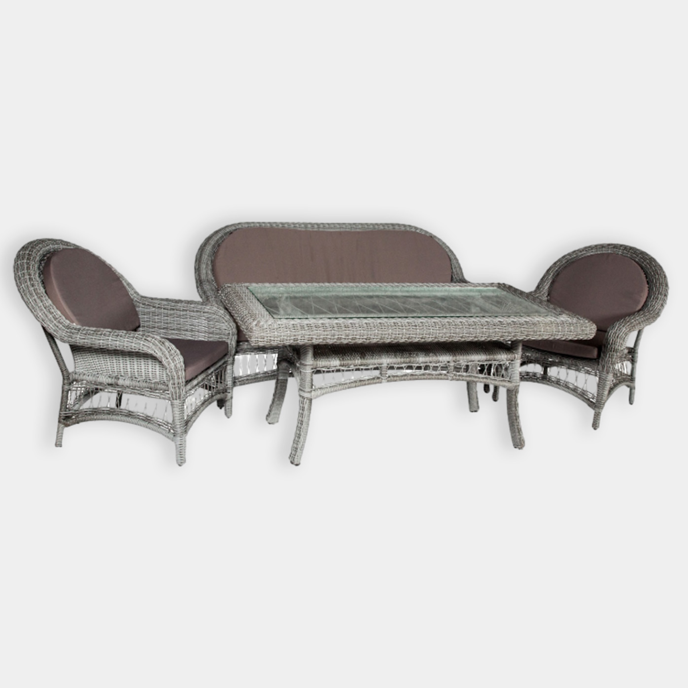 В комплекте : стол обеденный прямоугольный, 2 кресла с подушками, софа 2-х местная с подушками. Столешница - каленое стекло 6 мм.
